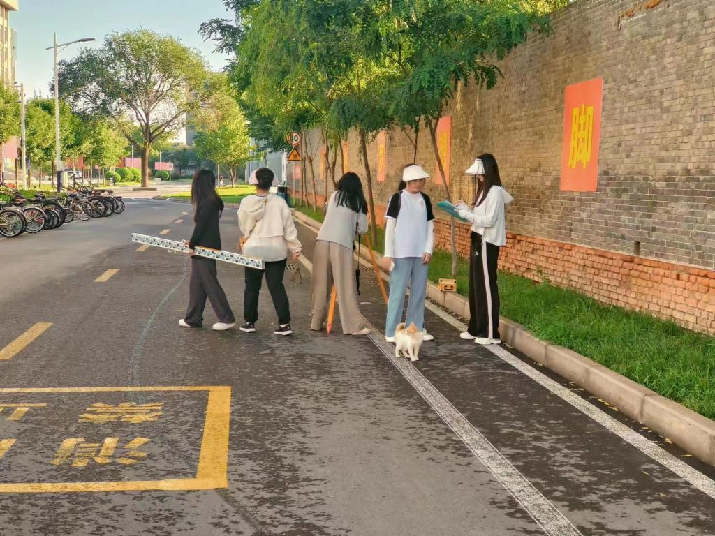 水平控制测量需要使用全站仪,利用测回法测量水平角。因为设点的问题,临近组之间协商合作,共同完成了这一工作。当天工作结束之后,同学们对当天的数据进行处理,认真进行内业计算,保证数据的准确性。在高程水准测量完成之后,同学们开始进行碎部测量。碎部测量之前,王亚晋老师带领组长去骑行整个校园,对校园进行分块和分组,并讲述之后的相关注意事项。