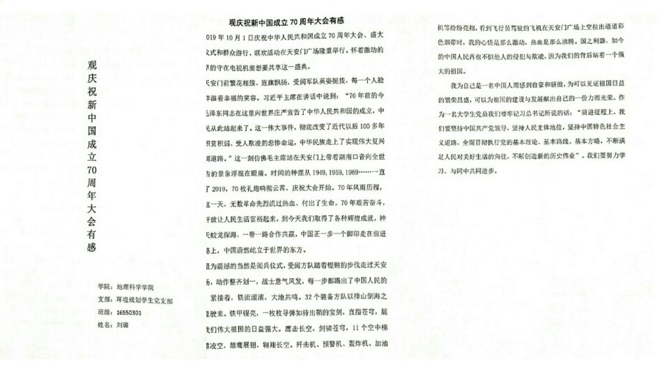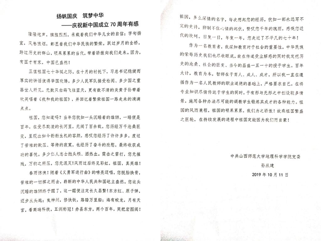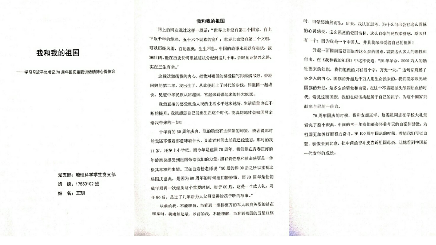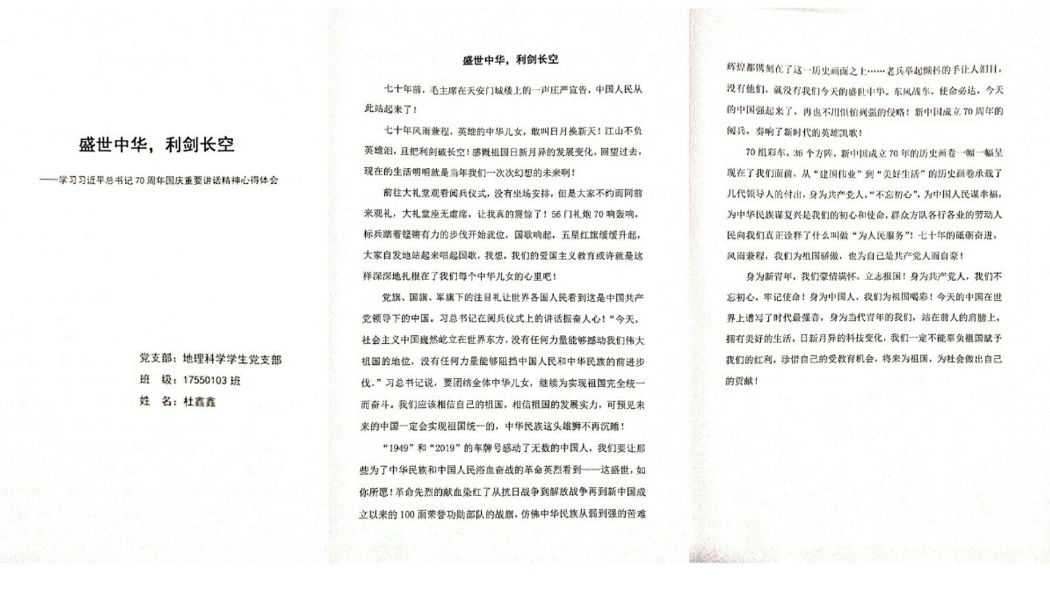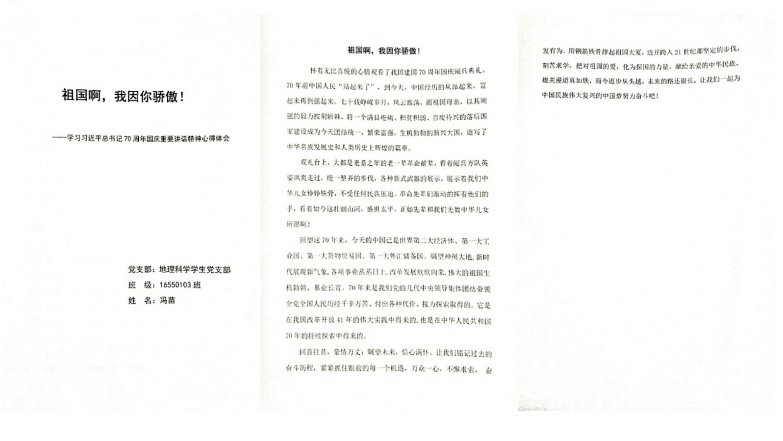 “中国的昨天已经写在人类的史册上,中国的今天正在亿万人民手中创造,中国的明天必将更加美好。”习近平总书记在新中国成立70周年大会上重要讲话和天安门广场上的庆祝盛典点燃了中华儿女的爱国热情。公司师生充分利用网络、广播、电视、报纸、微博、微信等平台,认真收听收看大会实况及国庆阅兵式。公司各支部结合“不忘初心、牢记使命”主题教育,组织各党员学习了重要讲话,并交流了学习体会。以下是公司党委选取各支部部分优秀作品与大家分享。