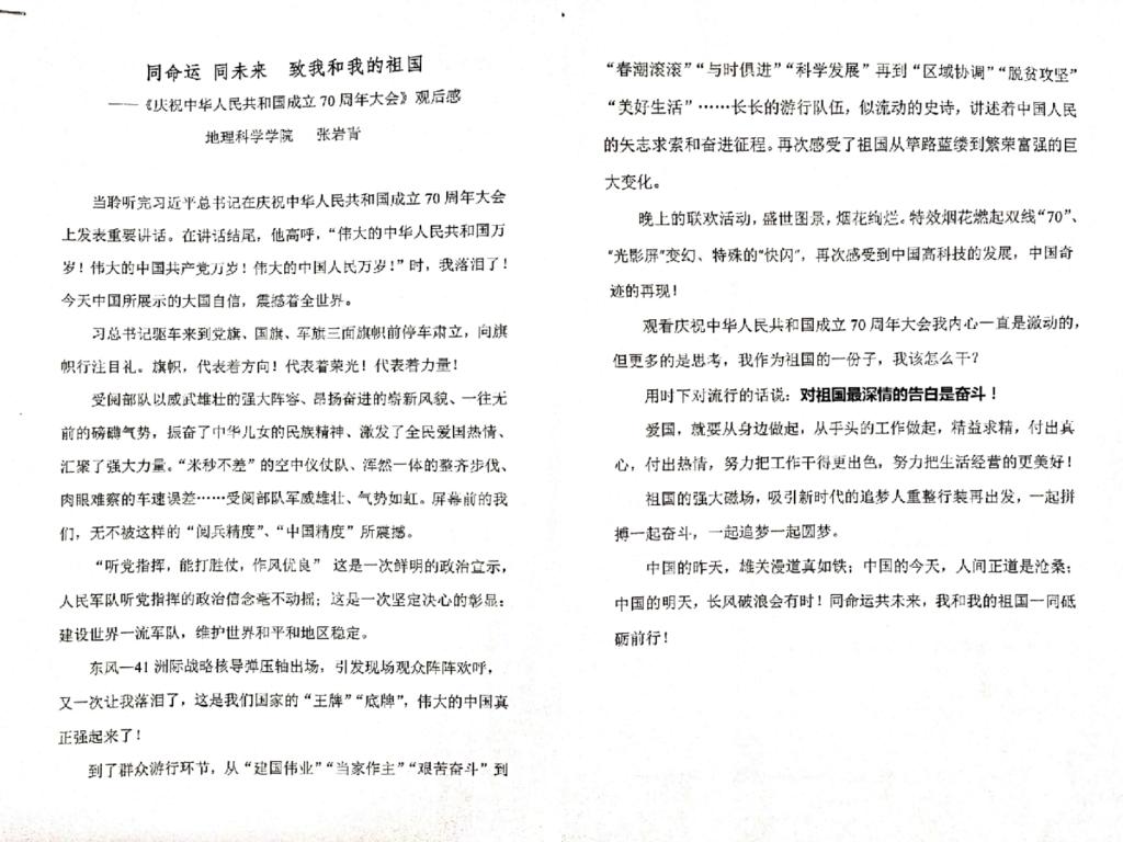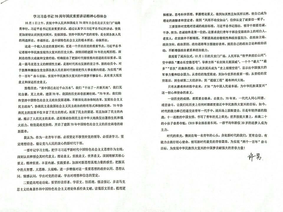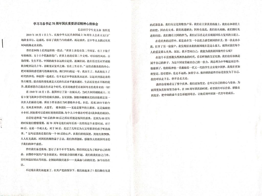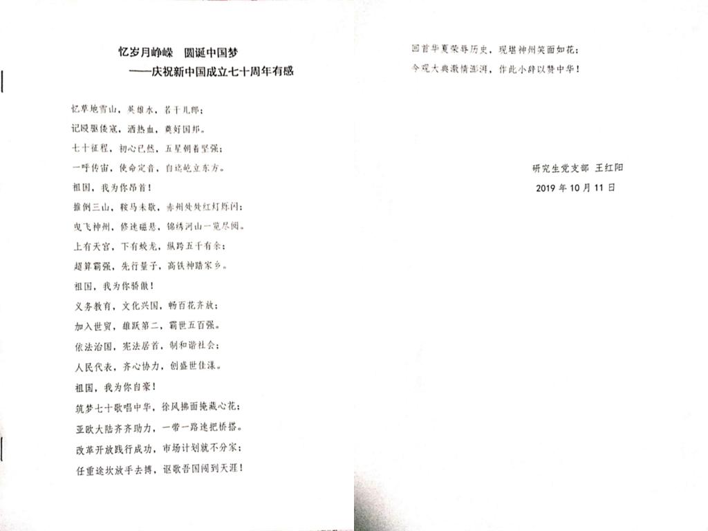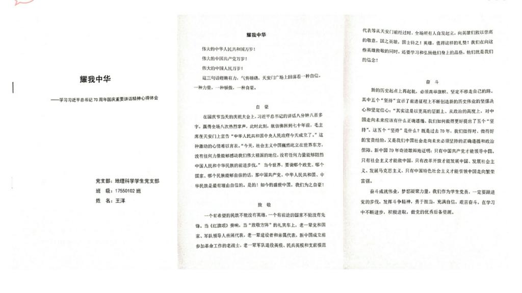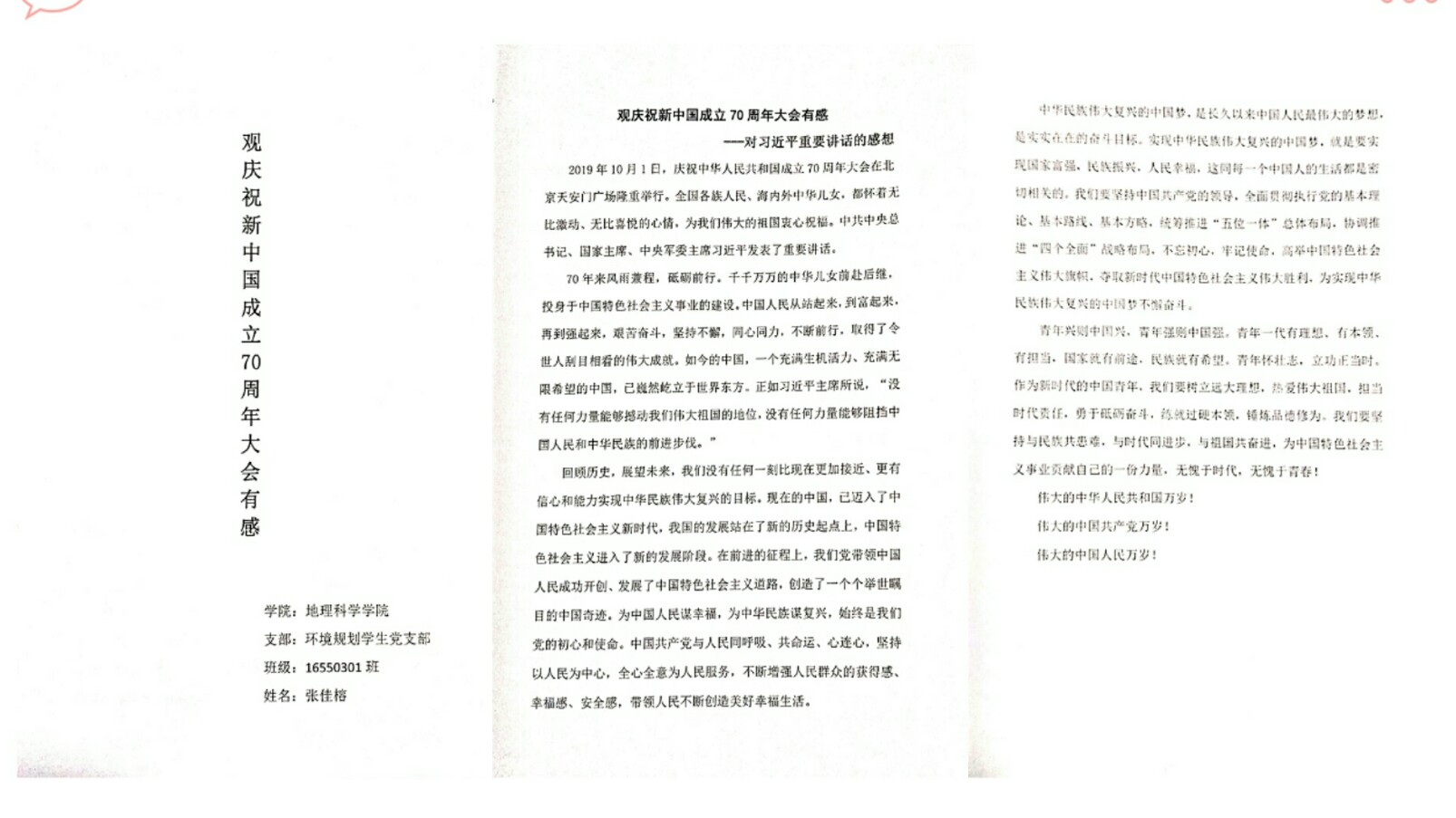 “中国的昨天已经写在人类的史册上,中国的今天正在亿万人民手中创造,中国的明天必将更加美好。”习近平总书记在新中国成立70周年大会上重要讲话和天安门广场上的庆祝盛典点燃了中华儿女的爱国热情。公司师生充分利用网络、广播、电视、报纸、微博、微信等平台,认真收听收看大会实况及国庆阅兵式。公司各支部结合“不忘初心、牢记使命”主题教育,组织各党员学习了重要讲话,并交流了学习体会。以下是公司党委选取各支部部分优秀作品与大家分享。