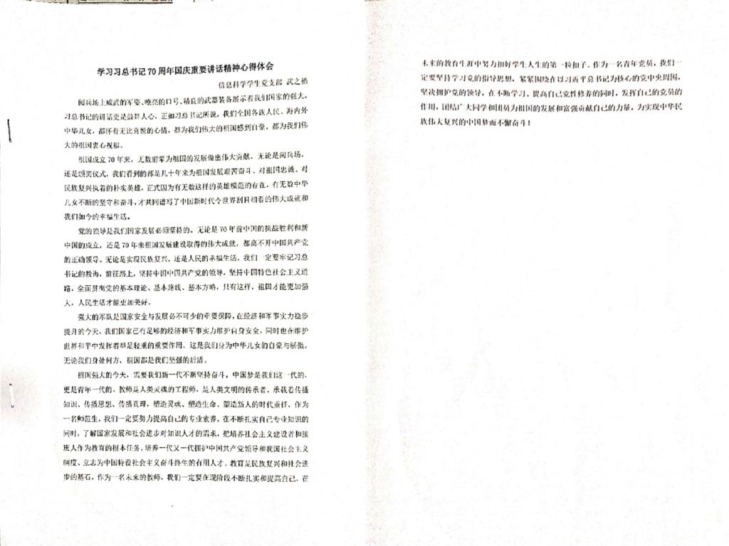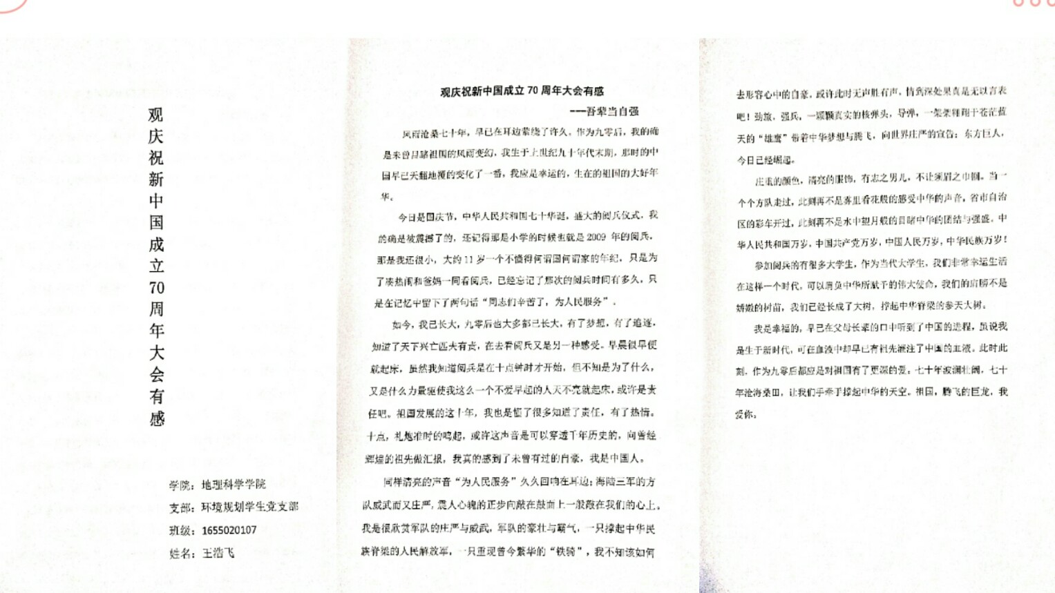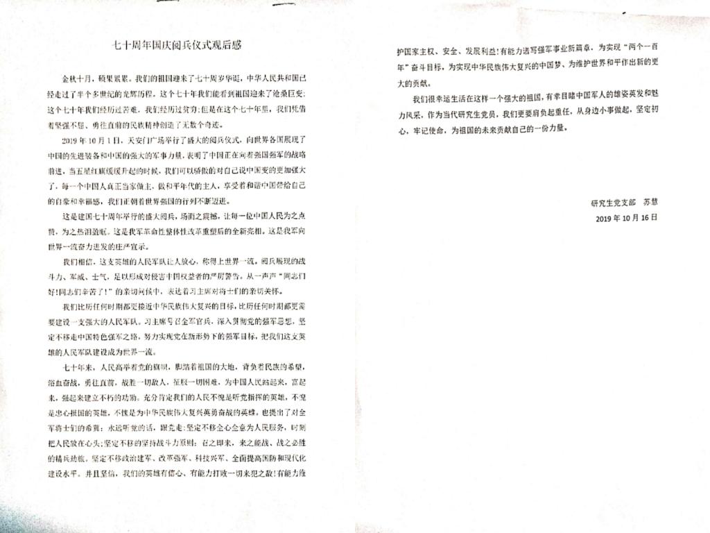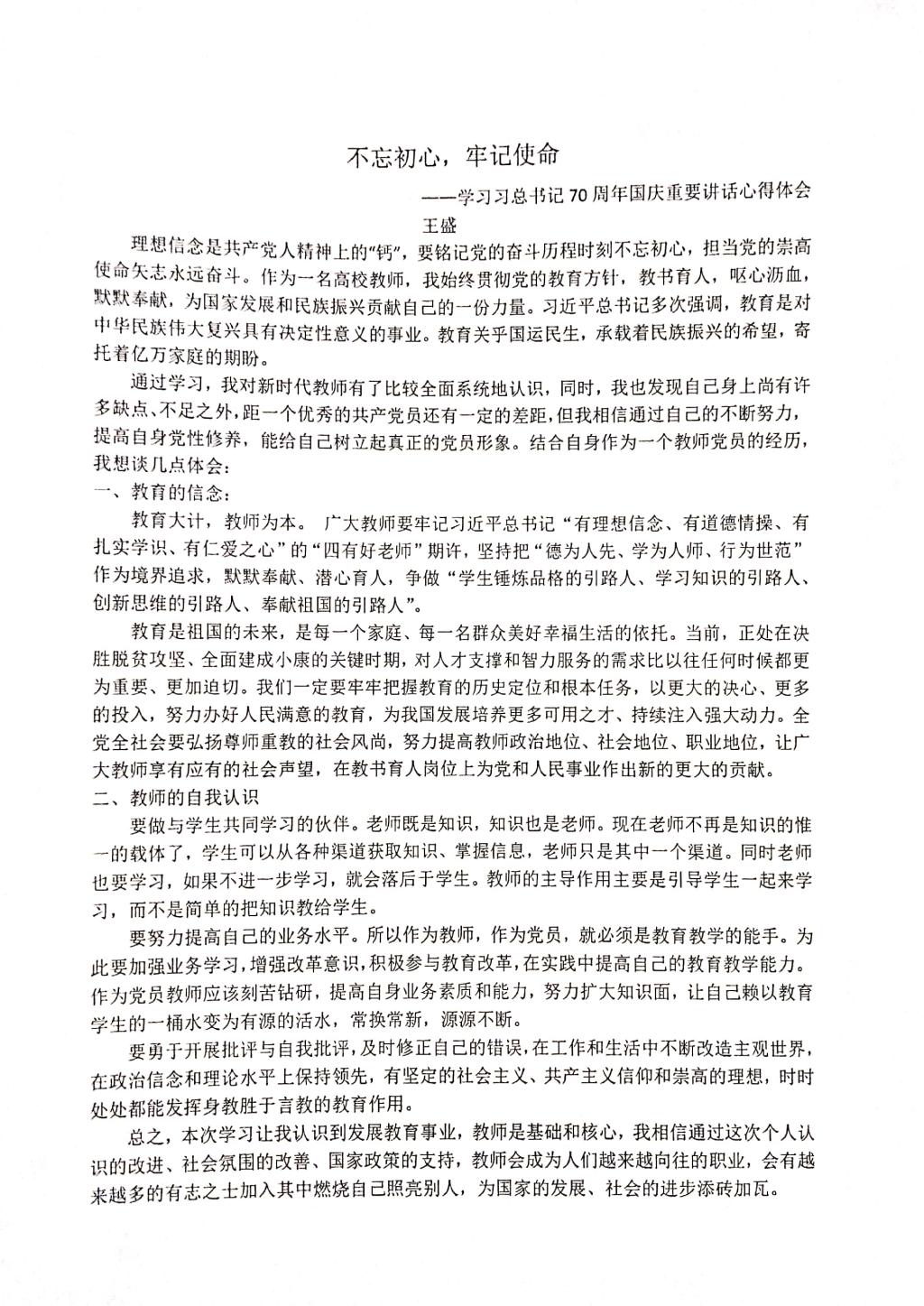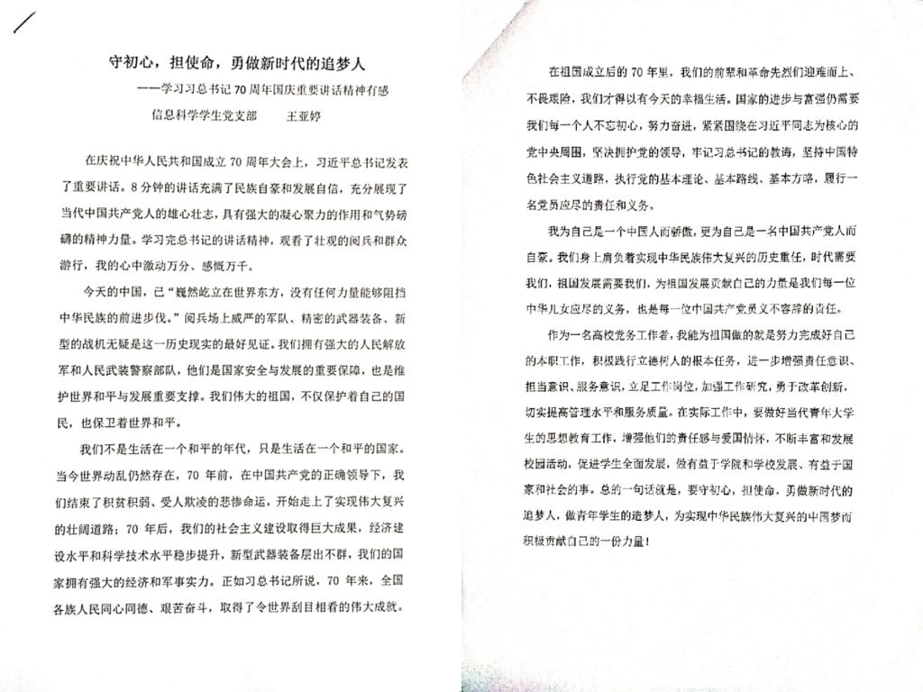 “中国的昨天已经写在人类的史册上,中国的今天正在亿万人民手中创造,中国的明天必将更加美好。”习近平总书记在新中国成立70周年大会上重要讲话和天安门广场上的庆祝盛典点燃了中华儿女的爱国热情。公司师生充分利用网络、广播、电视、报纸、微博、微信等平台,认真收听收看大会实况及国庆阅兵式。公司各支部结合“不忘初心、牢记使命”主题教育,组织各党员学习了重要讲话,并交流了学习体会。以下是公司党委选取各支部部分优秀作品与大家分享。