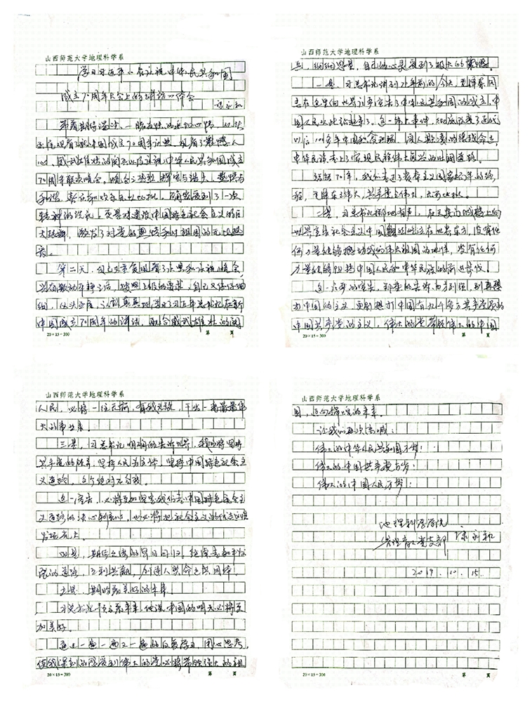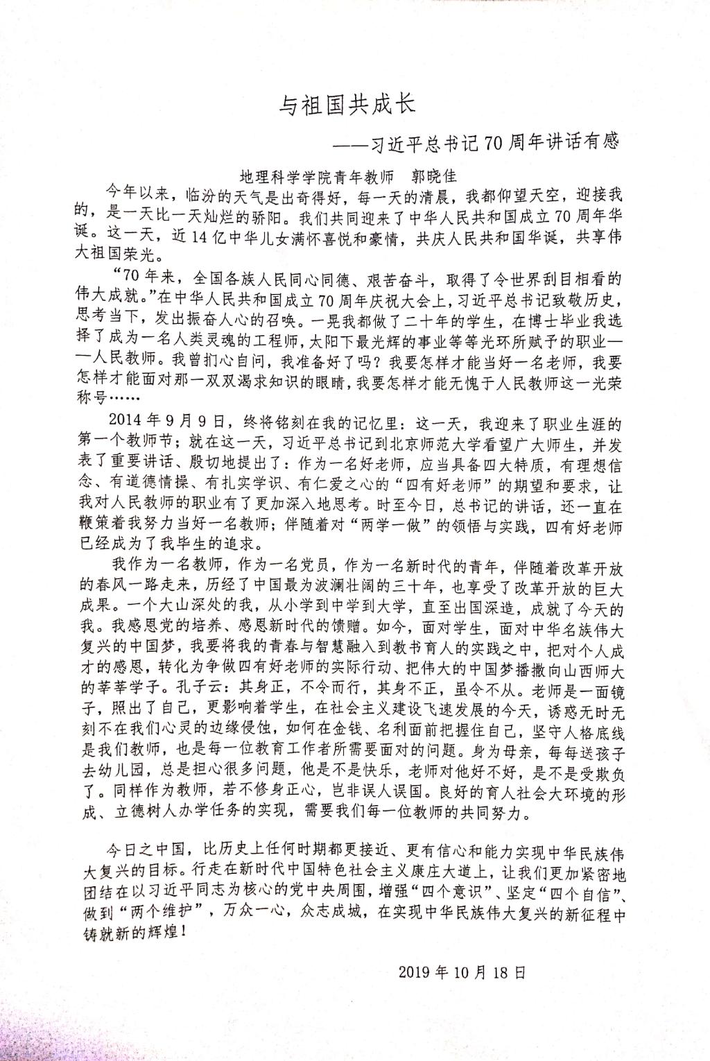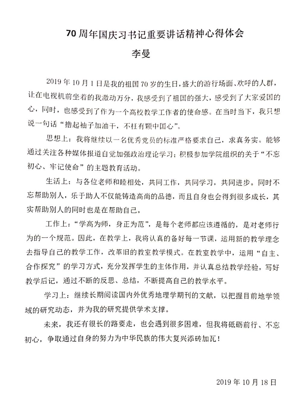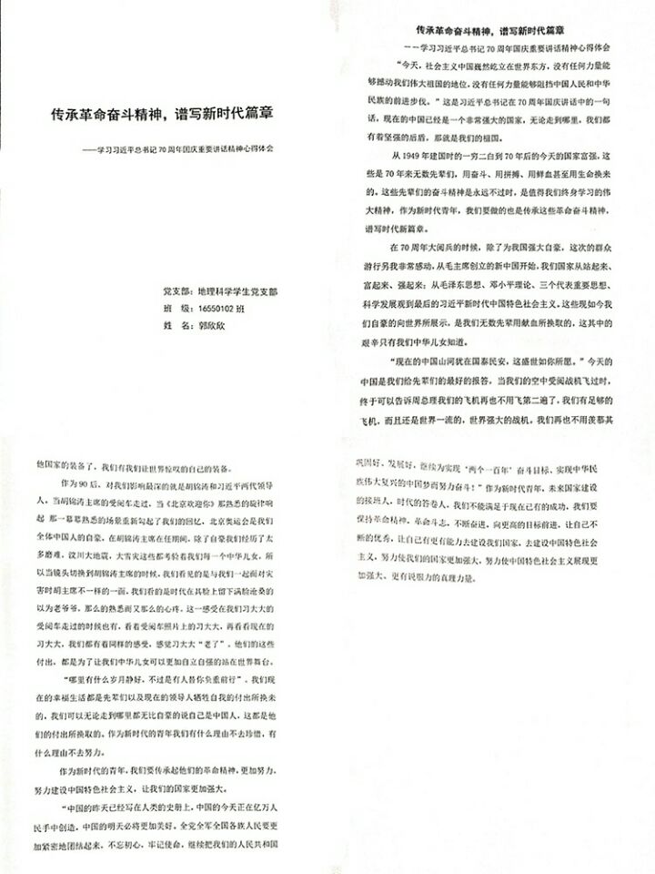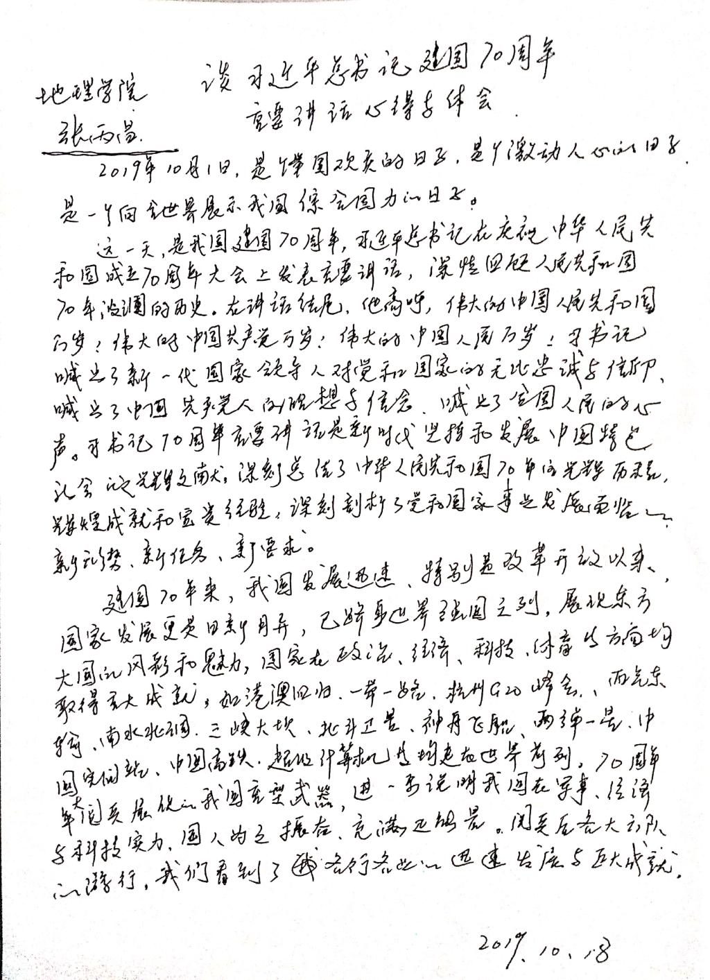 “中国的昨天已经写在人类的史册上,中国的今天正在亿万人民手中创造,中国的明天必将更加美好。”习近平总书记在新中国成立70周年大会上重要讲话和天安门广场上的庆祝盛典点燃了中华儿女的爱国热情。公司师生充分利用网络、广播、电视、报纸、微博、微信等平台,认真收听收看大会实况及国庆阅兵式。公司各支部结合“不忘初心、牢记使命”主题教育,组织各党员学习了重要讲话,并交流了学习体会。以下是公司党委选取各支部部分优秀作品与大家分享。